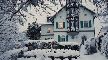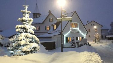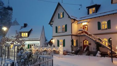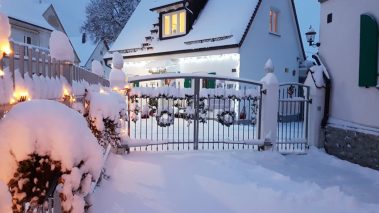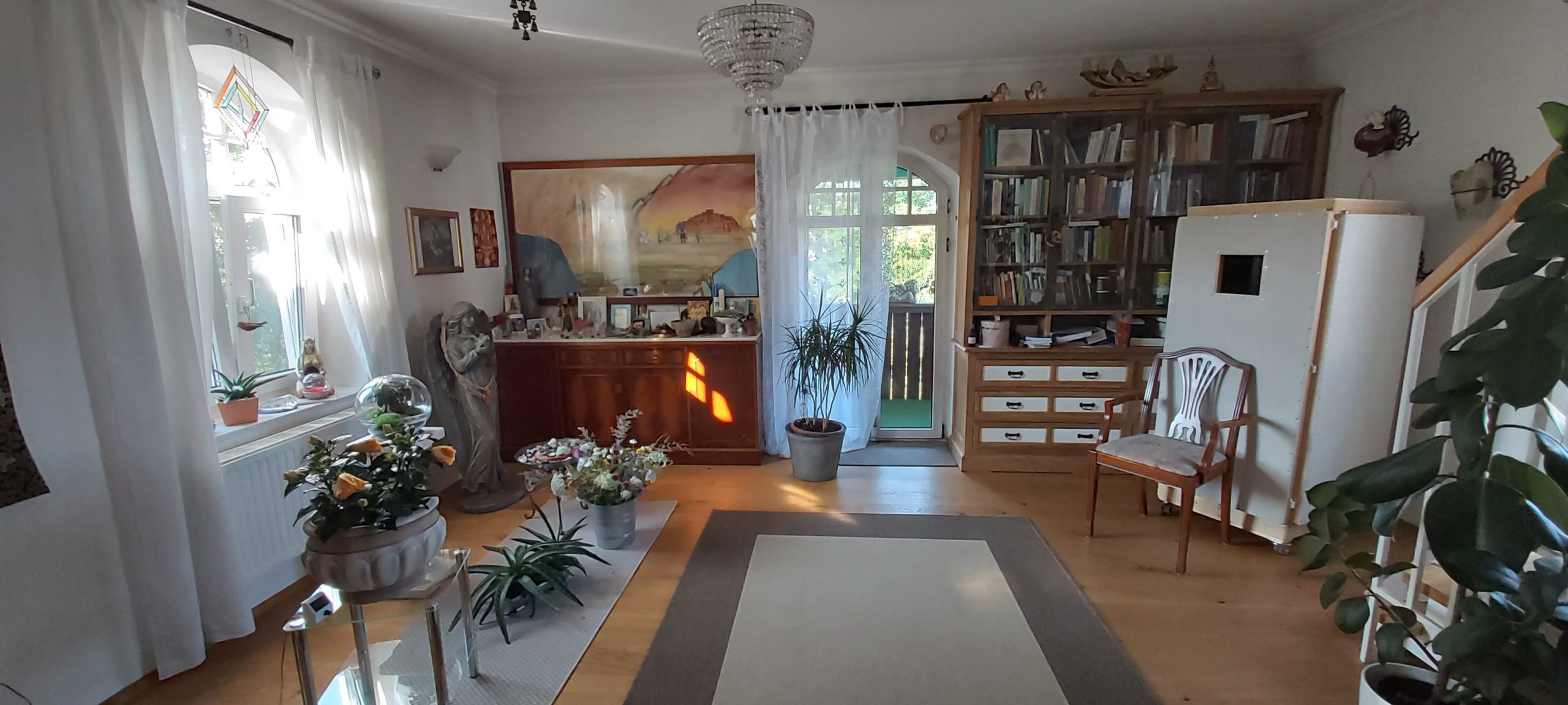 Im Sommer ist das Haus Richtung Süden mit Bäumen gesäumt, die zu einem Hang gehören, einige Bäume gehören zu Grundstück, das 2022 neu vermessen wurde. Eigentlich sind es 3 Grundstücke, eines mit der Villa, das zweite mit dem Gästehaus und ein kleines ca. 160 qm am Hang. Ich habe es nicht an die Gemeinde abgegeben, um die Bäume vor Kahlschlag zu bewahren.